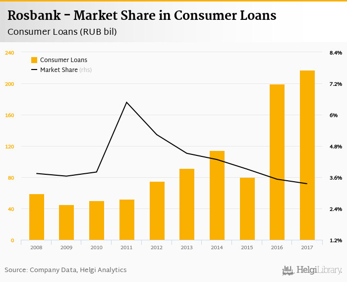Rosbank accounted for 3.35% of all consumer loans issued in Russia at the end of 2017. Historically, the bank’s market share in consumer loans reached an all time high of 6.47% in 2011 and an all time low of 3.35% in 2017.