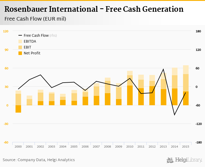 The company generated cash, defined by a sum of net profit and depreciation, of EUR 36.5 mil or 4.22% of sales. When investments are excluded, free cash flow reached EUR -19.6 mil, or -2.26% of sales in 2015.