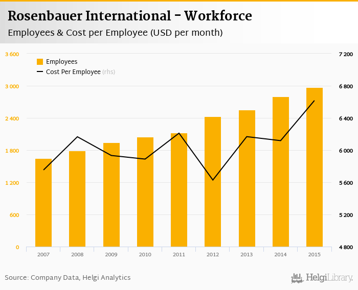 Rosenbauer International employed 2,969 employees in 2015, up 6.04% compared to the previous year. Historically, between 2006 and 2015, the firm's workforce hit a high of 2,969 employees in 2015 and a low of 1,517 employees in 2006.