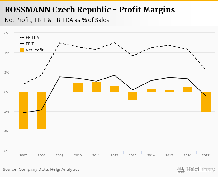 ROSSMANN Czech Republic made a net profit of CZK -56.7 mil with revenues of CZK 2,724 mil in 2017, down by 480% and down by 0.542%, respectively, compared to the previous year.