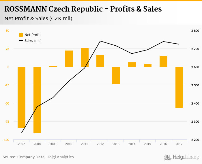 ROSSMANN Czech Republic made a net profit of CZK -56.7 mil in 2017, down 480% compared to the previous year. Total sales reached CZK 2,724 mil, which is down 0.542% when compared to the previous year.