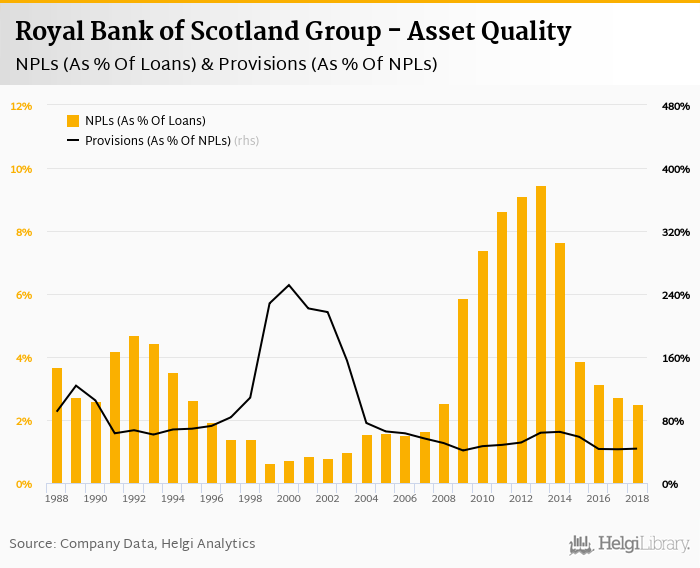 Royal Bank of Scotland Group's non-performing loans reached 2.50% of total loans at the end of 2018, down from 2.72% compared to the previous year. Historically, the NPL ratio hit an all time high of 9.47% in 2013 and an all time low of 0.645% in 1999.