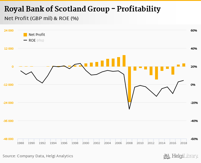 Royal Bank of Scotland Group made a net profit of GBP 2,092 mil in 2018, up 51.6% compared to the previous year. This implies a return on equity of 4.38%.