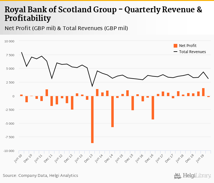 Royal Bank of Scotland Group made a net profit of GBP -210 mil under revenues of GBP 3,077 mil in the third quarter of 2019, down 138% and 20.7% respectively when compared to the same period last year.