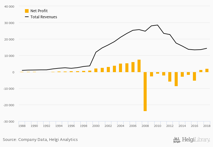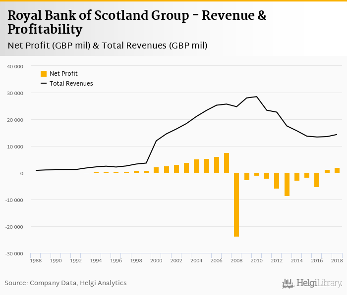 Royal Bank of Scotland Group made a net profit of GBP 2,092 mil under revenues of GBP 14,323 mil in 2018, up 51.6% and 5.97% respectively compared to the previous year.