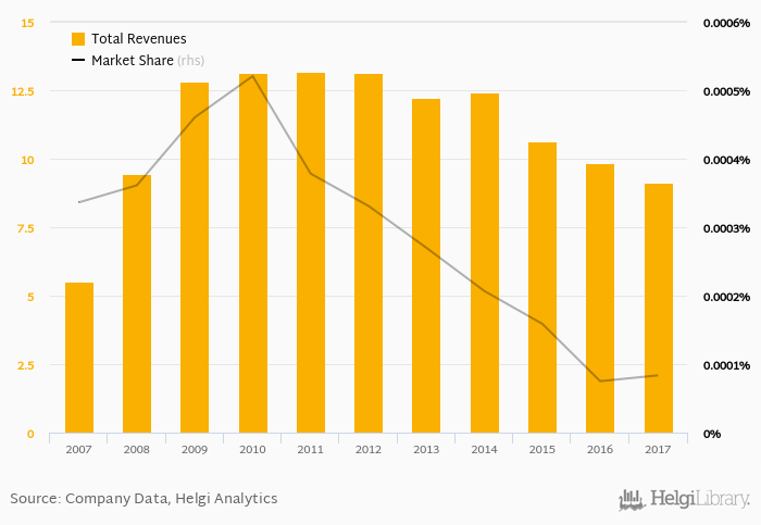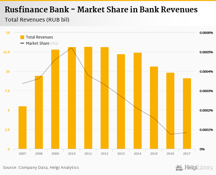 As a result, Rusfinance Bank accounted for < 0.001% of all bank revenues generated by banks in Russia in 2017. Historically, the bank’s market share in total revenues reached an all time high of < 0.001% in 2010 and an all time low of < 0.001% in 2016.