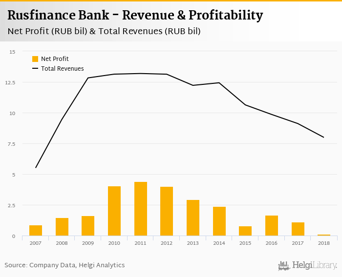Rusfinance Bank made a net profit of RUB 0.115 bil under revenues of RUB 7.98 bil in 2018, up -89.6% and -12.4% respectively compared to the previous year.