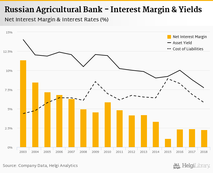 Comparing Russian Agricultural Bank with its closest peers, Sberbank operated in 2018 with a net interest margin of 5.00% in 2018, VTB Bank reached 3.37% and Alfa Bank some 4.43%.
