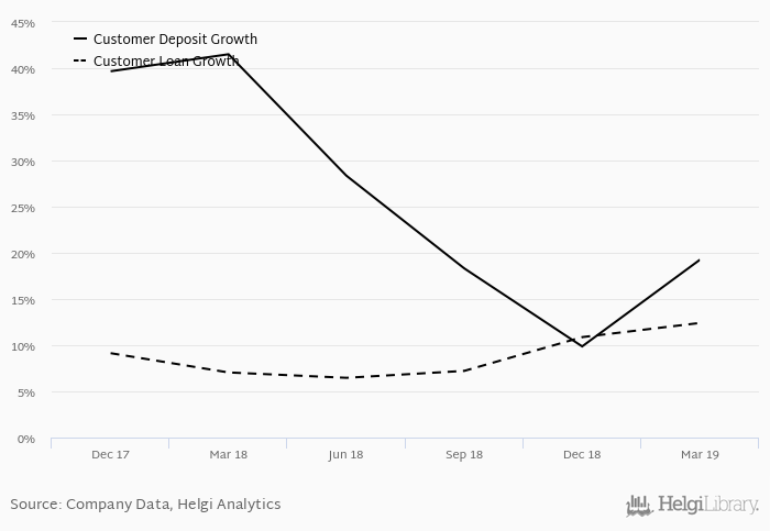 On the other hand, bank's customer deposit growth amounted to 19.3% at the end of 2019-03-31, down from 41.5% when compared to the previous year. Historically, the bank’s deposit growth reached an all time high of 41.5% in 2018-03-31 and an all time low of 9.87% in 2018-12-31. In the last decade, the average annual loan growth amounted to 0%.