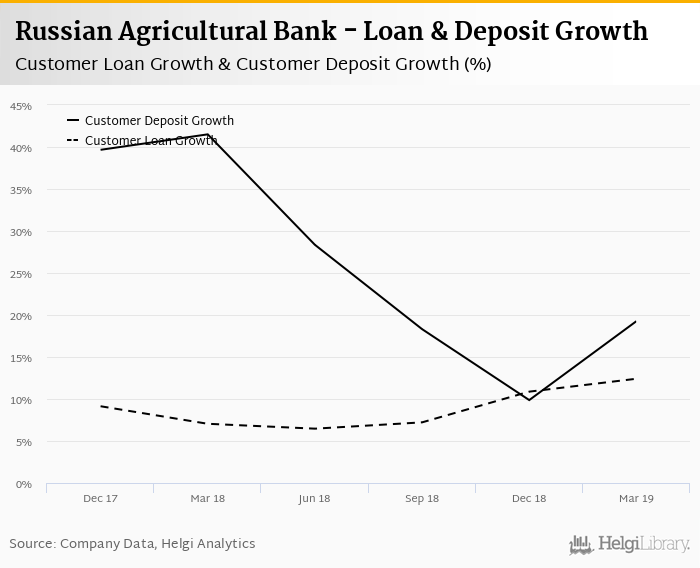 At the end of 2019-03-31, Russian Agricultural Bank's loans accounted for 76.4% of total deposits and 61.7% of total assets.