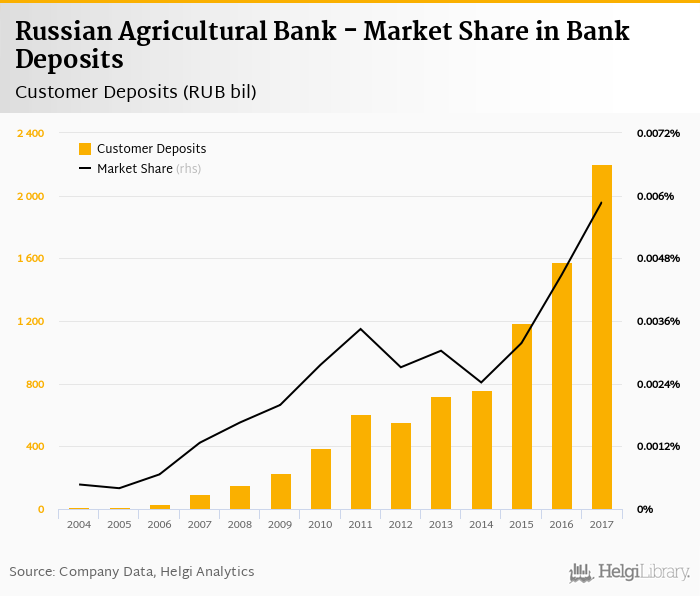 Russian Agricultural Bank accounted for 0.006% of all customer deposits taken by banks in Russia at the end of 2017. Historically, the bank’s market share in customer deposits reached an all time high of 0.006% in 2017 and an all time low of < 0.001% in 2005.
