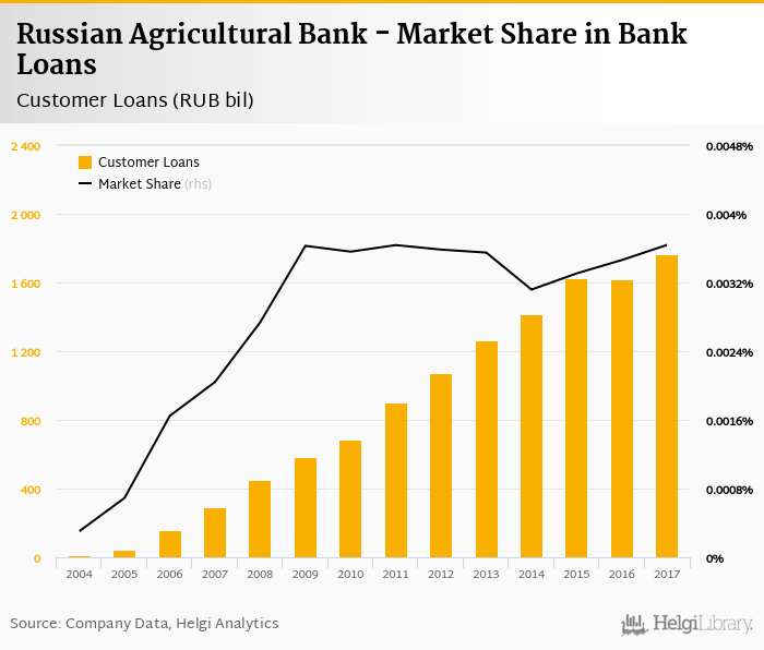 Russian Agricultural Bank accounted for 0.004% of all customer loans issued in Russia at the end of 2017. Historically, the bank’s market share in customer loans reached an all time high of 0.004% in 2017 and an all time low of < 0.001% in 2004.