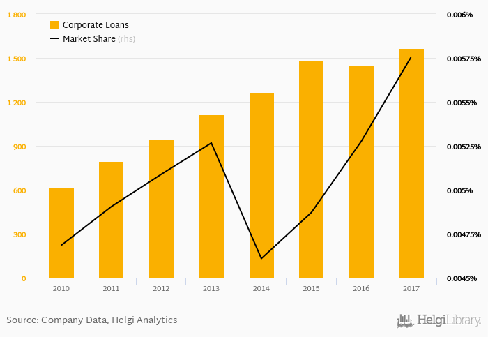 Russian Agricultural Bank accounted for 0.006% of all corporate loans issued in Russia at the end of 2017. Historically, the bank’s market share in corporate loans reached an all time high of 0.006% in 2017 and an all time low of 0.005% in 2014.