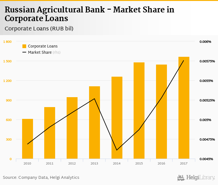 Russian Agricultural Bank's corporate loans reached RUB 1,565 bil in 2017, up 8.22% compared to the previous year.