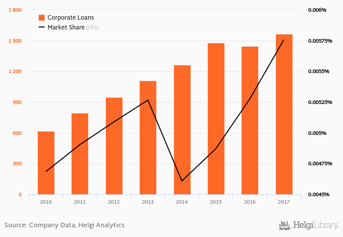 Russian Agricultural Bank accounted for 0.006% of all corporate loans issued in Russia at the end of 2017. Historically, the bank’s market share in corporate loans reached an all time high of 0.006% in 2017 and an all time low of 0.005% in 2014.
