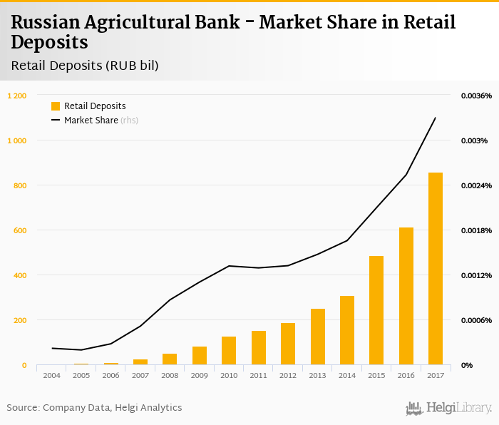 Russian Agricultural Bank accounted for 0.003% of all retail deposits taken by banks in Russia at the end of 2017. Historically, the bank’s market share in retail deposits reached an all time high of 0.003% in 2017 and an all time low of < 0.001% in 2005.