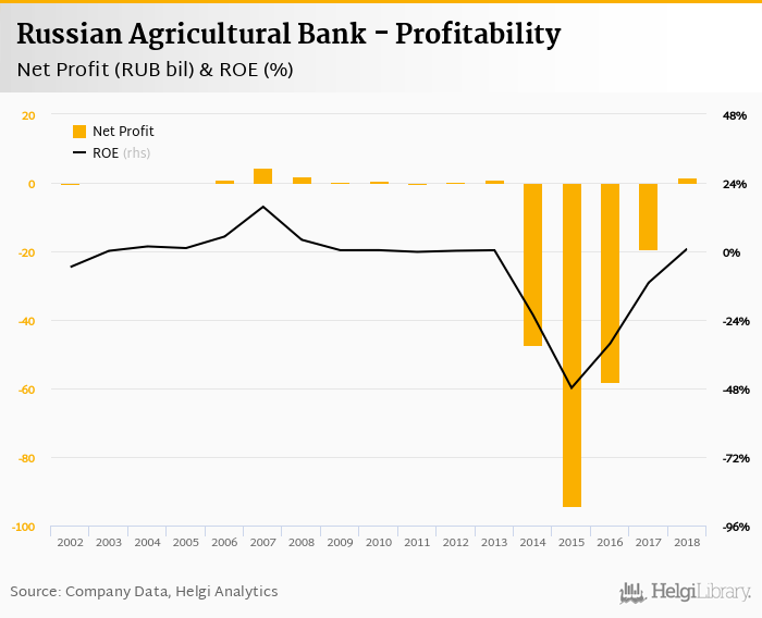 Russian Agricultural Bank made a net profit of RUB 1.56 bil in 2018, up 108% compared to the previous year. This implies a return on equity of 0.911%.
