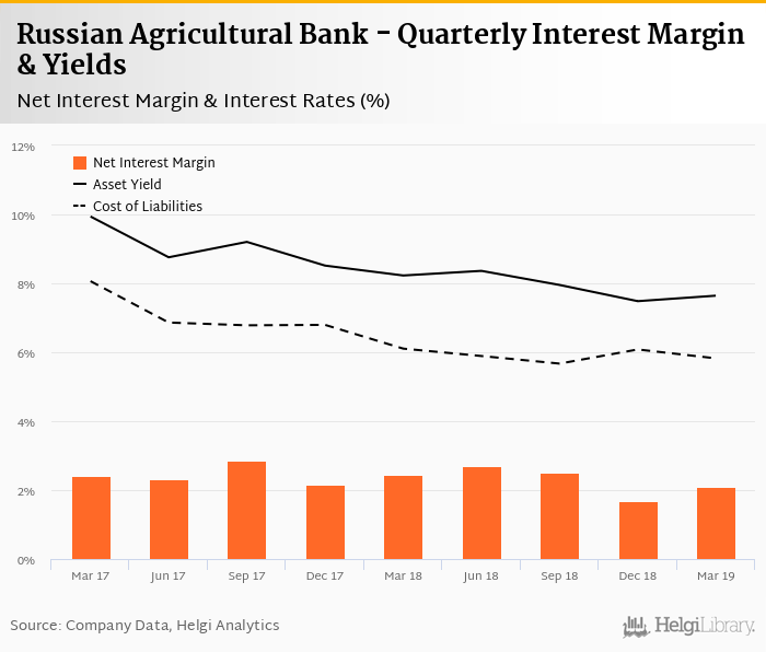Russian Agricultural Bank's net interest margin amounted to 2.09% in the first quarter of 2019, up from 1.67% when compared to the previous quarter.