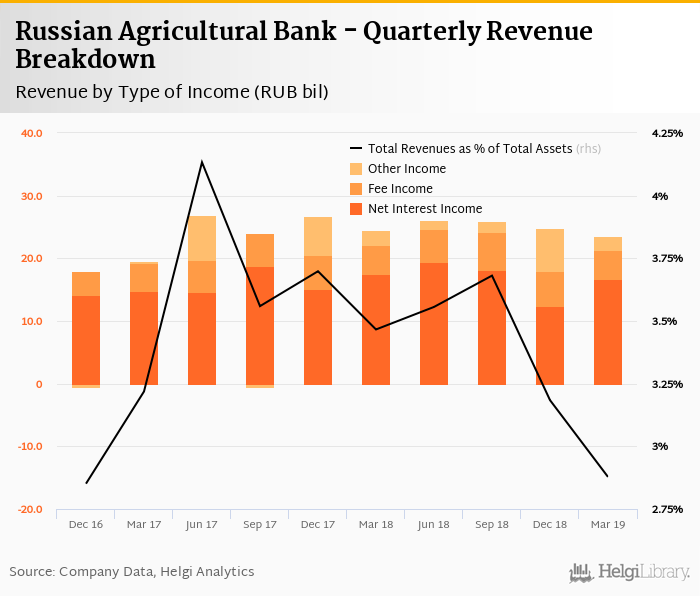 Russian Agricultural Bank generated total banking revenues of RUB 23.5 bil in the first quarter of 2019, down 4.23% when compared to the same period of last year and 5.28% when compared to the previous quarter.