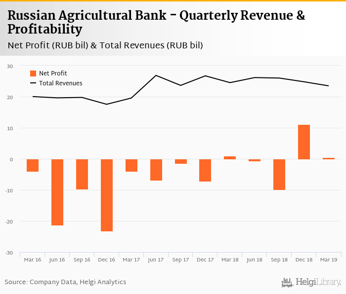 Russian Agricultural Bank made a net profit of RUB 0.513 bil under revenues of RUB 23.5 bil in the first quarter of 2019, down 48.1% and 4.23% respectively when compared to the same period last year.