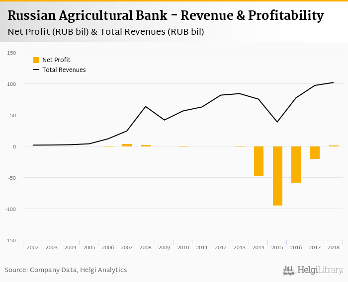 Comparing Russian Agricultural Bank with its closest peers, Sberbank generated a net profit of RUB 833 bil with revenues of RUB 1,933 bil in 2018, VTB Bank netted RUB 182 bil (revenues of RUB 605 bil) and Alfa Bank announced a net profit of RUB 89.5 bil (revenues of RUB 213 bil).