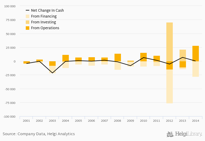 Cash from financing amounted to CZK -28,094 mil, so the company generated CZK -25.8 mil net cash in 2014.
