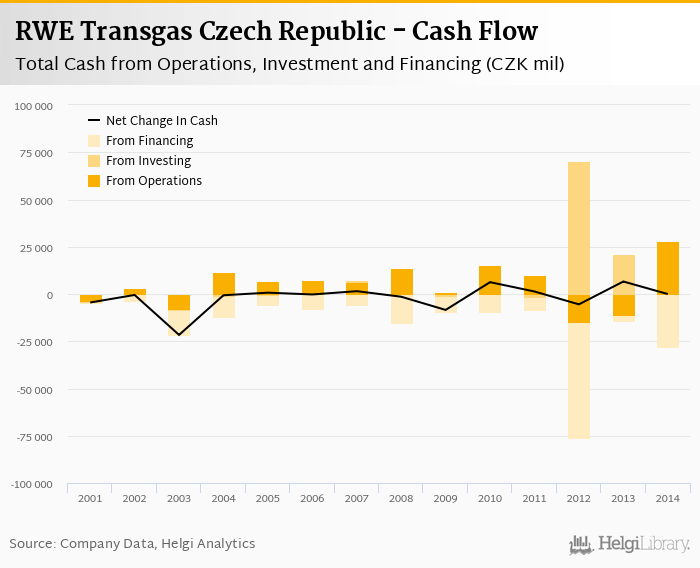 RWE Transgas Czech Republic's operating cash flow stood at CZK 28,065 mil in 2014, up 357% when compared to the previous year. Historically, between 2001 - 2014, the firm’s operating cash flow reached a high of CZK 28,065 mil in 2014 and a low of CZK -14,824 mil in 2012.