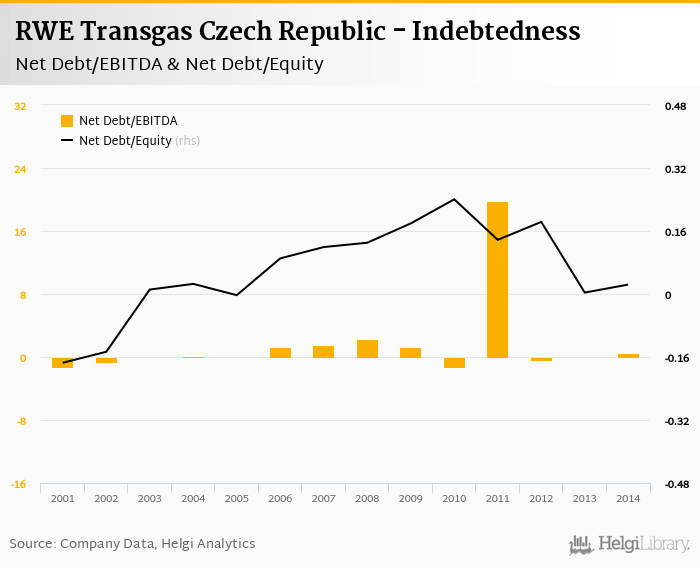 RWE Transgas Czech Republic's net debt stood at CZK 742 mil and accounted for 0.024 of equity at the end of 2014. The ratio is up 0.020 pp compared to the previous year.