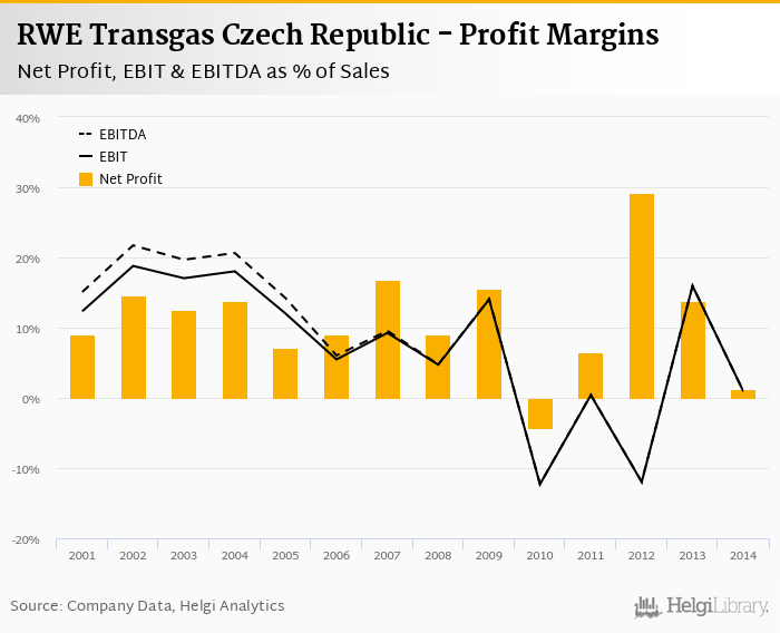 RWE Transgas Czech Republic made a net profit of CZK 1,744 mil with revenues of CZK 144,041 mil in 2014, down by 92.7% and down by 17.3%, respectively, compared to the previous year.