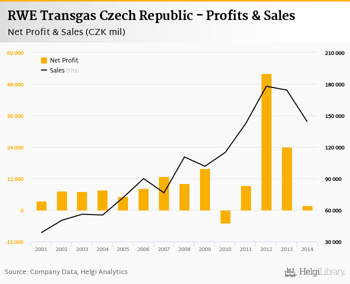 RWE Transgas Czech Republic made a net profit of CZK 1,744 mil in 2014, down 92.7% compared to the previous year. Total sales reached CZK 144,041 mil, which is down 17.3% when compared to the previous year.
