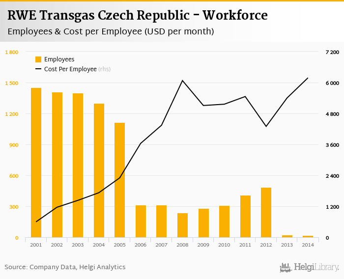 RWE Transgas Czech Republic employed 21.0 employees in 2014, down 19.2% compared to the previous year. Historically, between 2001 and 2014, the firm's workforce hit a high of 1,452 employees in 2001 and a low of 21.0 employees in 2014.