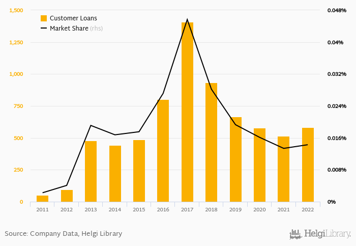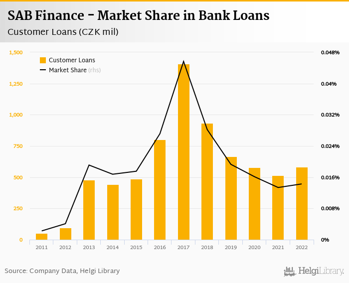 SAB Finance accounted for 0.014% of all customer loans issued in Czechia at the end of 2022. Historically, the bank’s market share in customer loans reached an all time high of 0.046% in 2017 and an all time low of 0.002% in 2011.