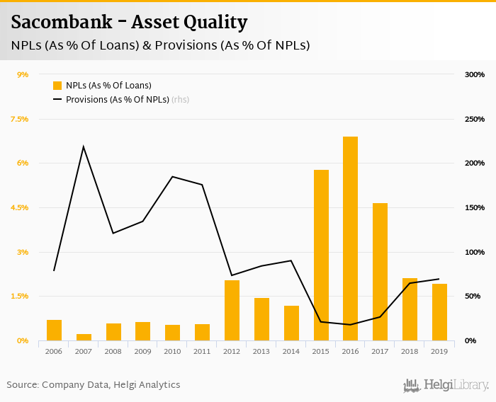 Sacombank's non-performing loans reached 1.94% of total loans at the end of 2019, down from 2.13% compared to the previous year. Historically, the NPL ratio hit an all time high of 6.91% in 2016 and an all time low of 0.230% in 2007.