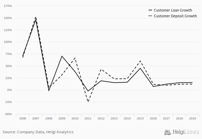 On the other hand, bank's customer deposit growth amounted to 12.1% at the end of 2019, up from 11.8% when compared to the previous year. Historically, the bank’s deposit growth reached an all time high of 153% in 2007 and an all time low of -25.3% in 2011. In the last decade, the average annual loan growth amounted to 20.8%.