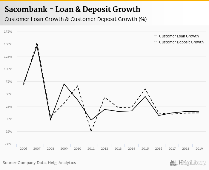 Sacombank's customer loan growth reached 15.4% in 2019, up from 14.9% compared to the previous year. Historically, the bank’s loans growth reached an all time high of 146% in 2007 and an all time low of -2.37% in 2011. In the last decade, the average annual loan growth amounted to 17.3%.