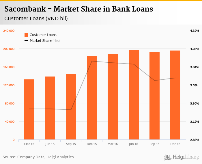 Sacombank accounted for 3.69% of all customer loans issued in Vietnam at the end of 2016-12-31. Historically, the bank’s market share in customer loans reached an all time high of 3.91% in 2015-12-31 and an all time low of 3.27% in 2015-09-30.