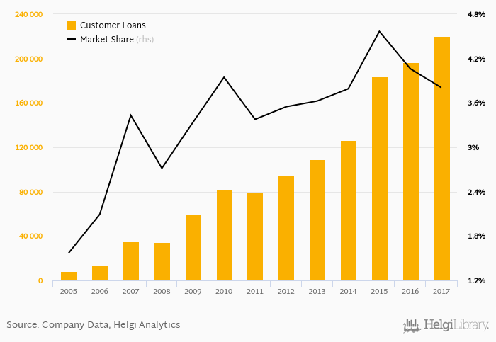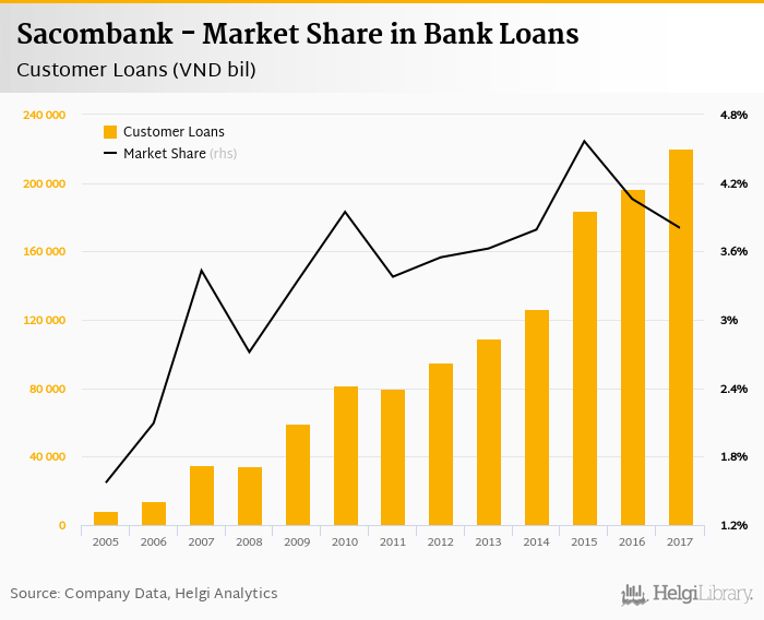 Sacombank accounted for 3.81% of all customer loans issued in Vietnam at the end of 2017. Historically, the bank’s market share in customer loans reached an all time high of 4.57% in 2015 and an all time low of 1.57% in 2005.