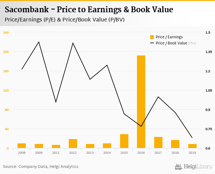 At the end of 2019, the bank traded at price to earnings of 9.07x. Within the last five years, the multiple reached an all time high of 192x in 2016 and an all time low of 9.07x in 2019 with an average of 54.3x.