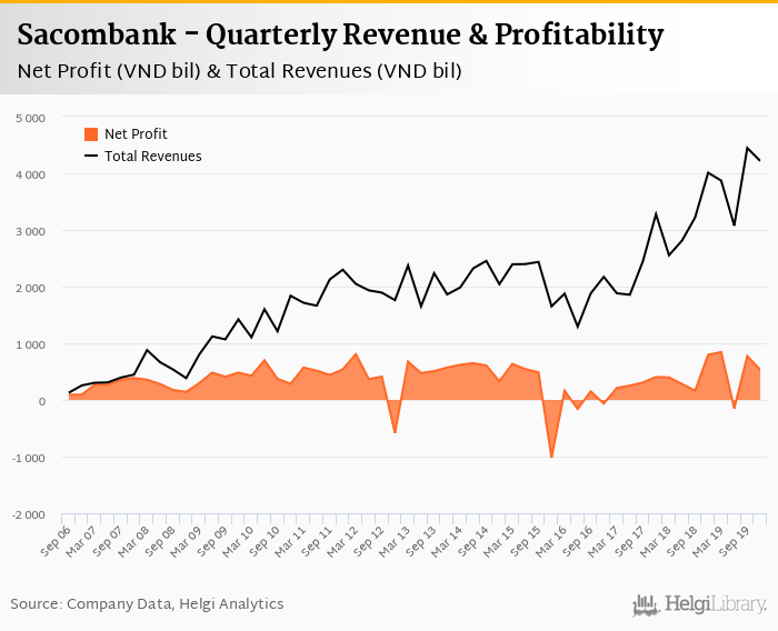 On the other hand, bank’s revenues amounted to an all time high of VND 4,447 bil in 3Q2019 and an all time low of VND 127 bil in 3Q2006. The average revenues in the last six quarters reached VND 3,807 bil.