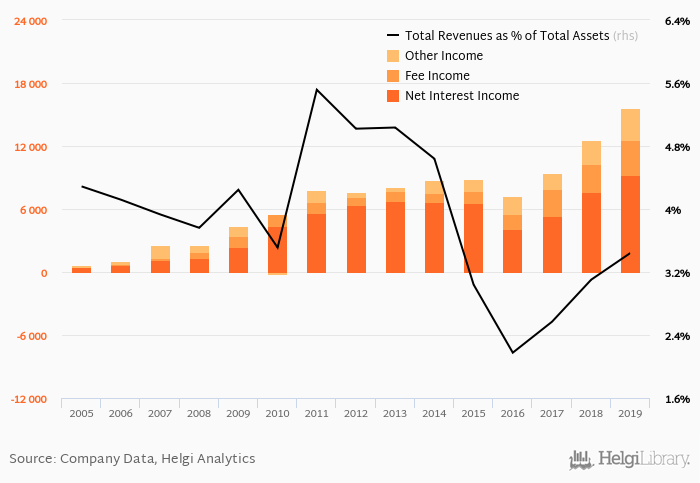 Bank's total revenues accounted for 3.44% total assets in 2019, up from 3.10% a year earlier.