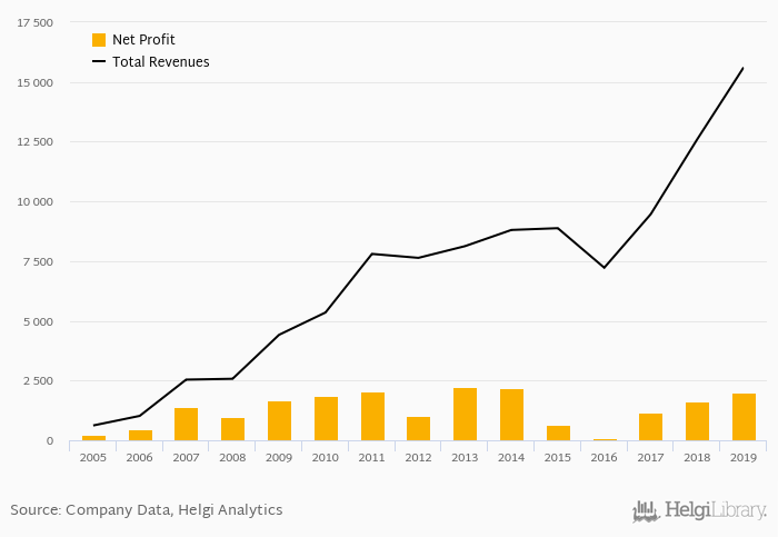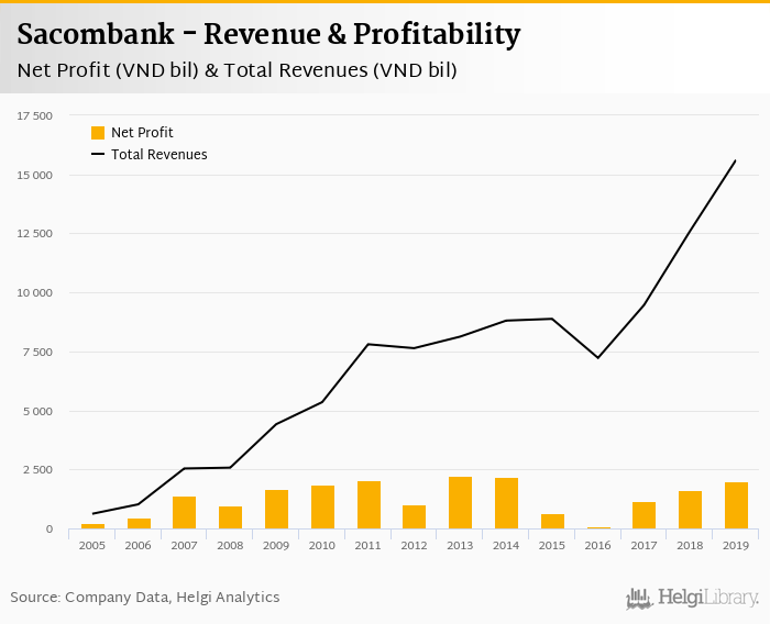 On the other hand, bank’s revenues amounted to an all time high of VND 15,610 bil in 2019 and an all time low of VND 620 bil in 2005. The average revenues in the last five years reached VND 10,754 bil.