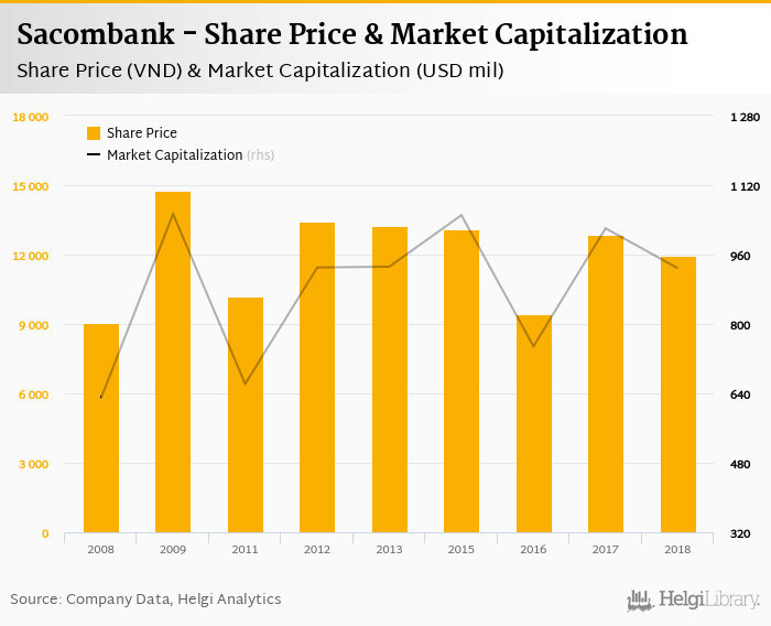 Sacombank stock traded at VND 11,950 per share at the end of 2018 implying a market capitalization of USD 929 mil.