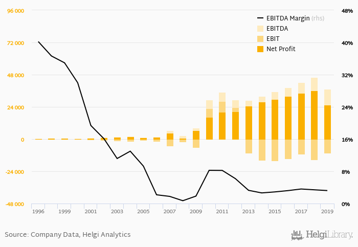 On the operating level, EBITDA reached CNY 27,155 mil, down 11.7% compared to the previous year. Over the last five years, company's EBITDA has risen 10.5% a year on average.