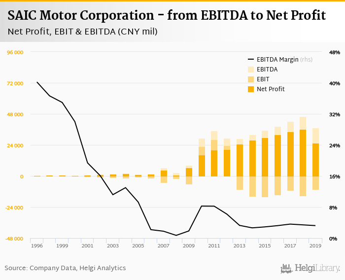 SAIC Motor Corporation made a net profit of CNY 25,603 mil with revenues of CNY 843,324 mil in 2019, down by 28.9% and down by 6.53%, respectively, compared to the previous year. This translates into a net margin of 3.04%.