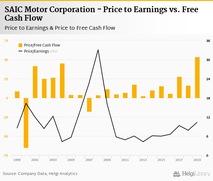 Regarding cash generated defined by the sum of net profit and depreciation, the stock traded at 7.10x at the end of 2019. When investments are excluded to get free cash flow, SAIC Motor Corporation traded at 53.6x.