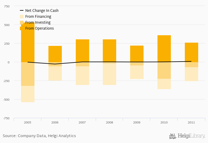 Cash from financing amounted to CZK -185 mil, so the company generated CZK 6.56 mil net cash in 2011.