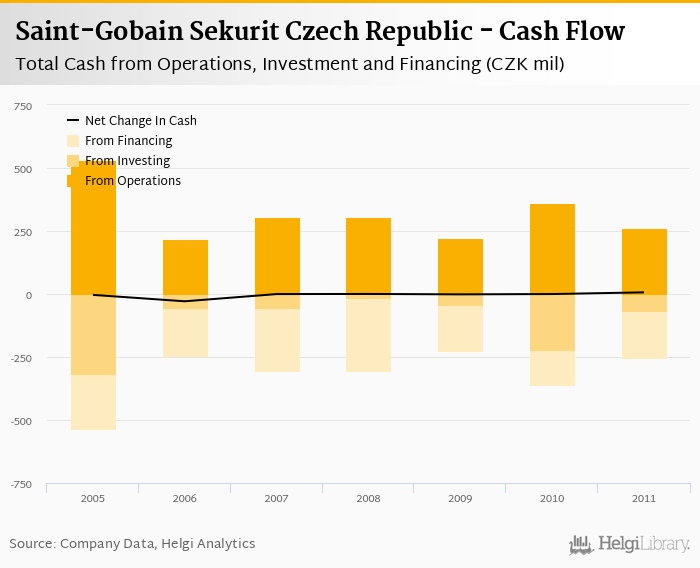 Saint-Gobain Sekurit Czech Republic's operating cash flow stood at CZK 261 mil in 2011, down 28% when compared to the previous year. Historically, between 2005 - 2011, the firm’s operating cash flow reached a high of CZK 530 mil in 2005 and a low of CZK 219 mil in 2006.