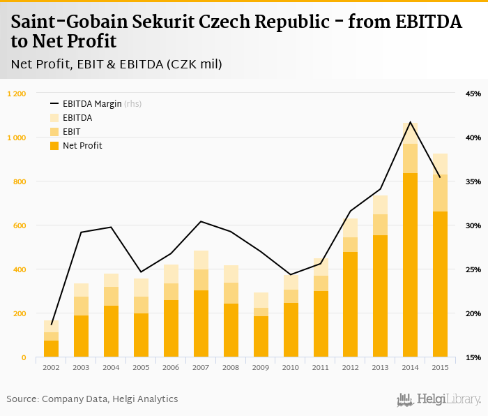 Saint-Gobain Sekurit Czech Republic made a net profit of CZK 665 mil with revenues of CZK 2,622 mil in 2015, down by 20.5% and up by 2.46%, respectively, compared to the previous year. This translates into a net margin of 25.4%.