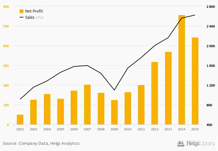 Sales have grown by 6.04% a year on average since 2005. They reached a high of CZK 2,622 mil in 2015 and a low of CZK 912 mil in 2002.