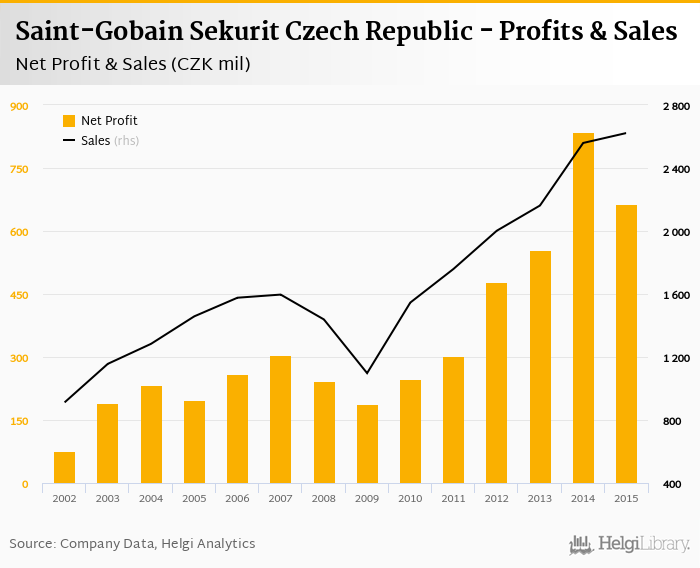 Saint-Gobain Sekurit Czech Republic made a net profit of CZK 665 mil in 2015, down 20.5% compared to the previous year. Total sales reached CZK 2,622 mil, which is up 2.46% when compared to the previous year.